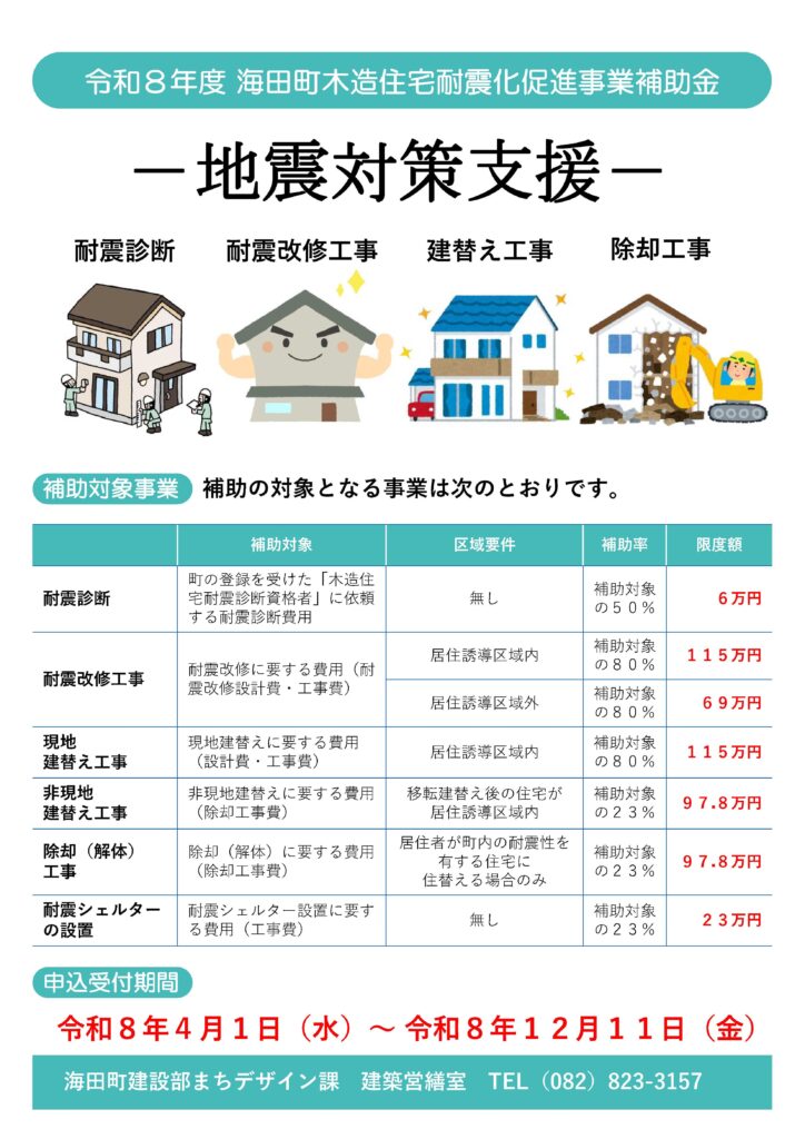 令和8年度 海田町木造住宅耐震化促進事業補助金 地震対策支援の お知らせを頂きましたのでお知らせいたします。